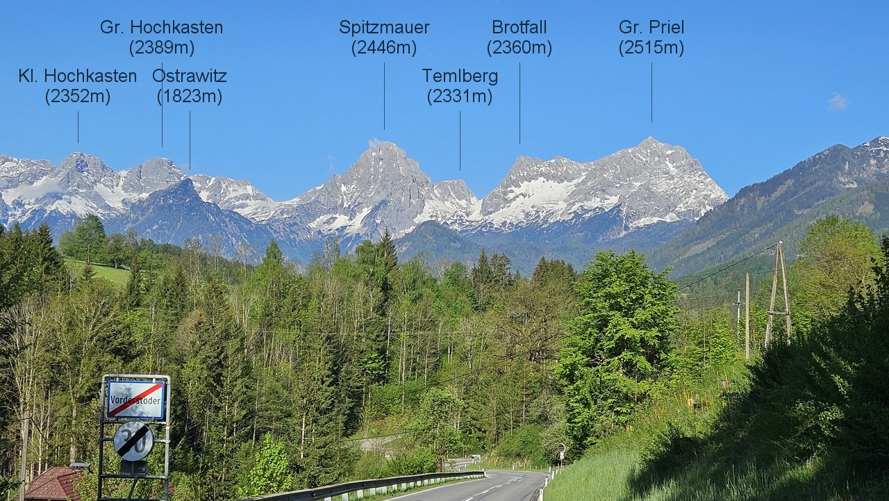 Bei der Fahrt von Vorderstoder nach Hinterstoder bietet sich nach einer Kurve dieses Bild: Unter einem Himmel von tiefem Vergissmeinnicht-Blau ist alles so makellos abgestimmt, dass das Auge ohne jede Hast von einem Gipfel zum anderen wandern kann.